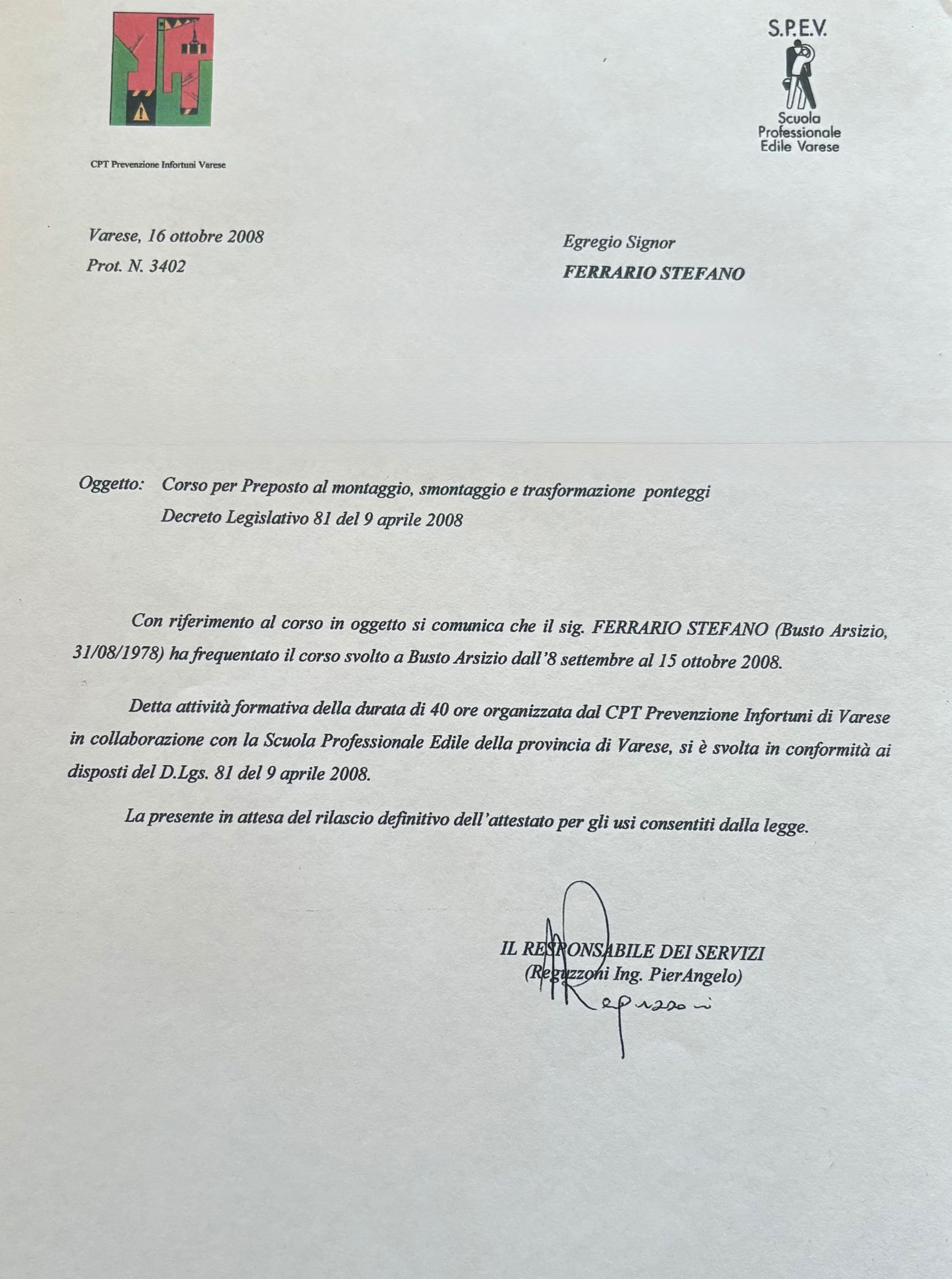 Il nostro team è formato attraverso corsi tecnici di aggiornamento, formazione sulla sicurezza nei cantieri e corsi per il montaggio e smontaggio di ponteggi. L’azienda è inoltre in possesso di tutti i requisiti richiesti dalla normativa vigente, tra cui la patente da cantiere per l’accesso e l’esecuzione dei lavori, come previsto dalla legge L. 56/2024 – art. 27 D.Lgs. 81/2008 e una polizza assicurativa conforme alle disposizioni di legge.